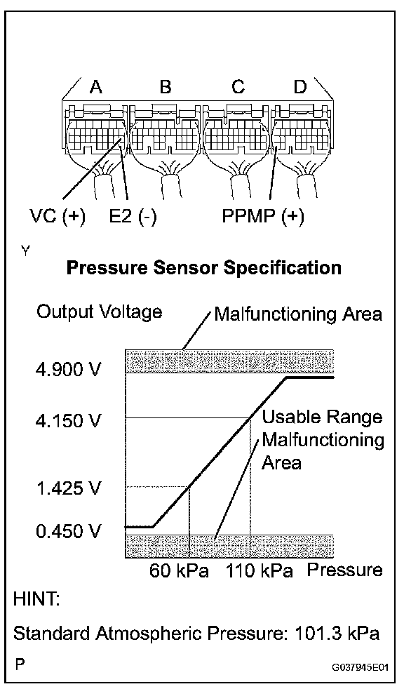 1. Using SST (turbocharger pressure gauge), apply air to the turbo pressure sensor at the pressures shown in the table.