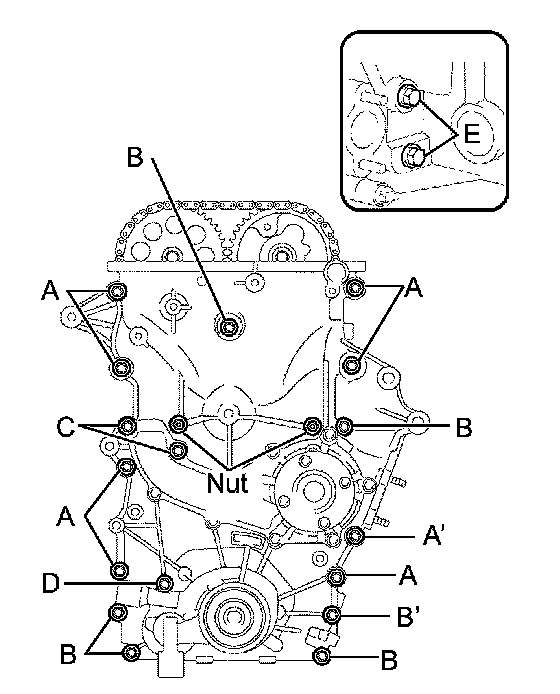 NOTICE: If the vehicle is equipped with air conditioning, install bolts A' and B' when installing the idle pulley with bracket since they are for this purpose.