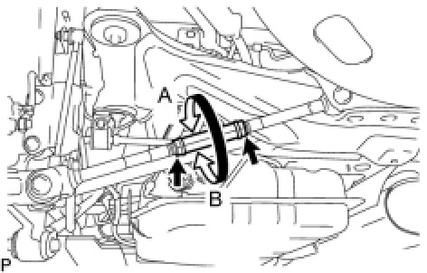 (1) If the toe-in measurement is greater than the specified range, extend the shorter rear No. 2 suspension arm assembly by rotating the adjusting tube in the direction of arrow B in the illustration.