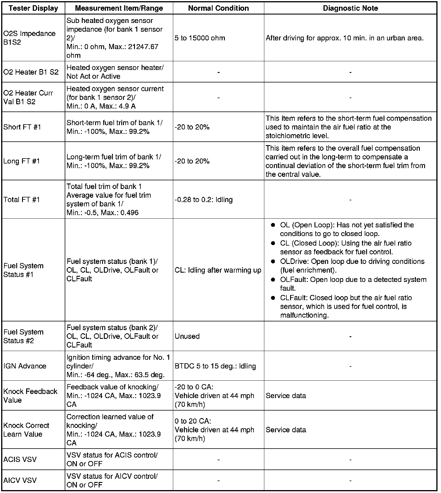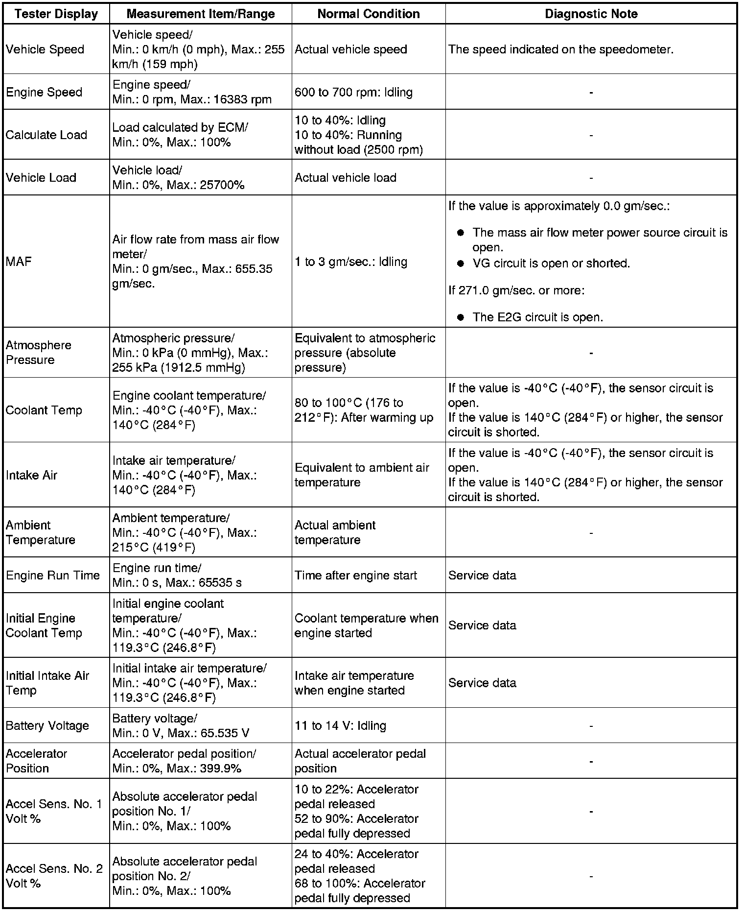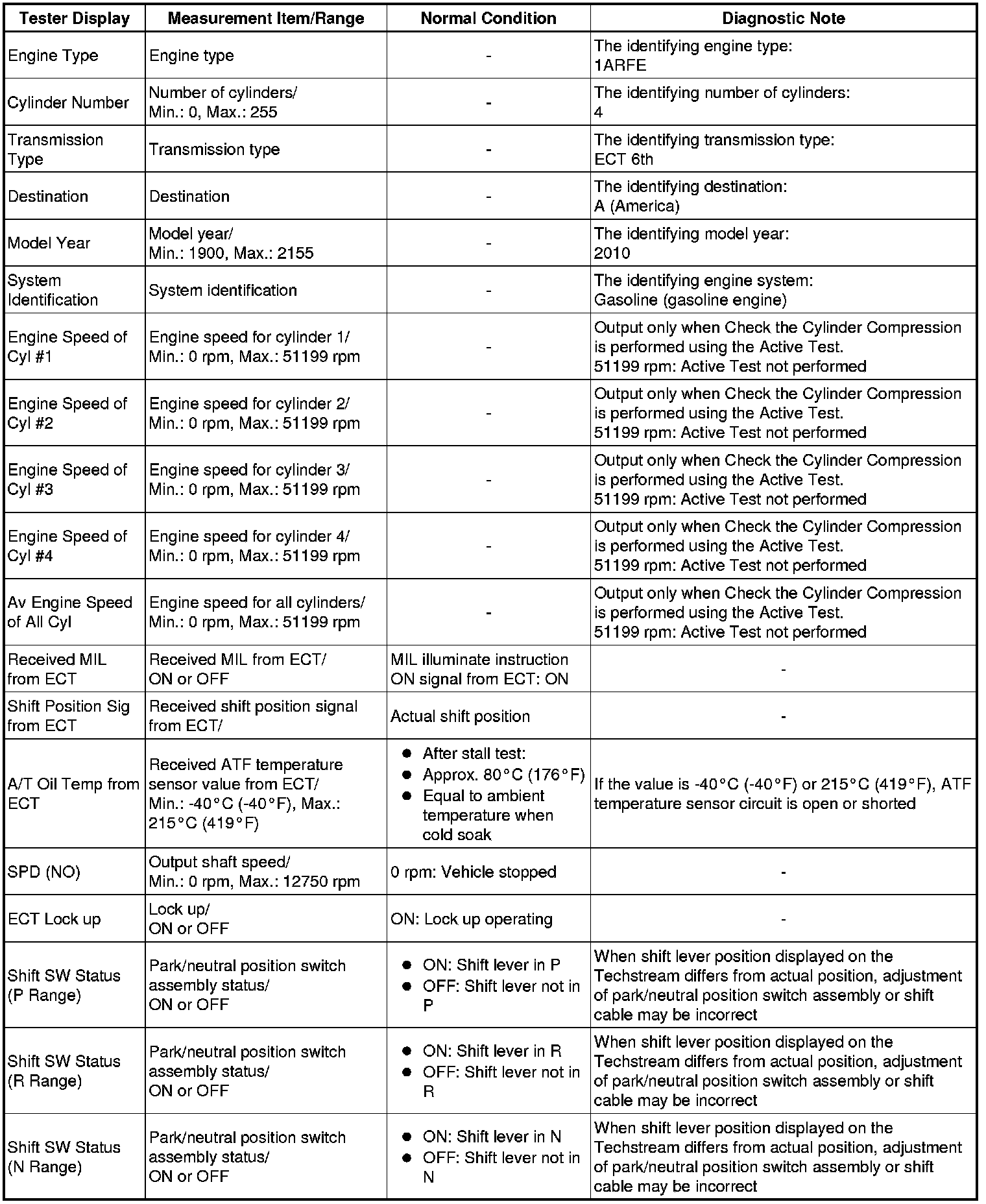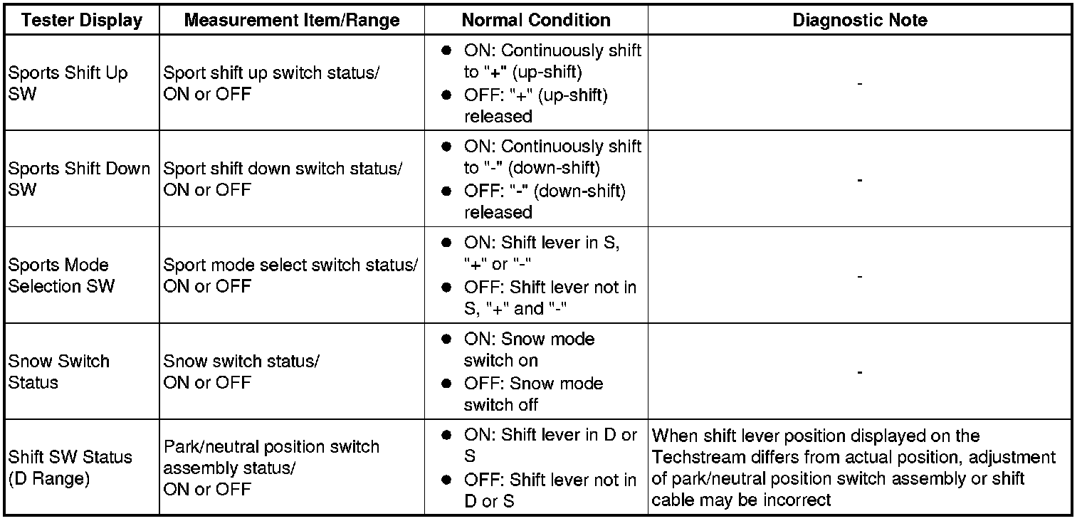 Using the Techstream to read the Data List allows the values or states of switches, sensors, actuators and other items to be read without removing any parts. This non-intrusive inspection can be very useful because intermittent conditions or signals may be discovered before parts or wiring is disturbed. Reading the Data List information early in troubleshooting is one way to save diagnostic time.
