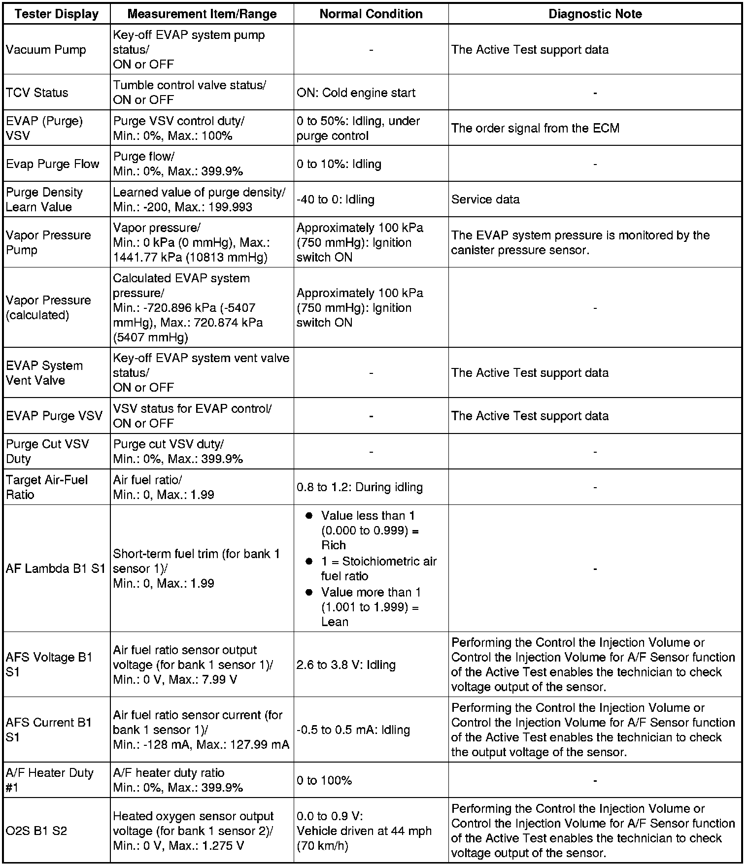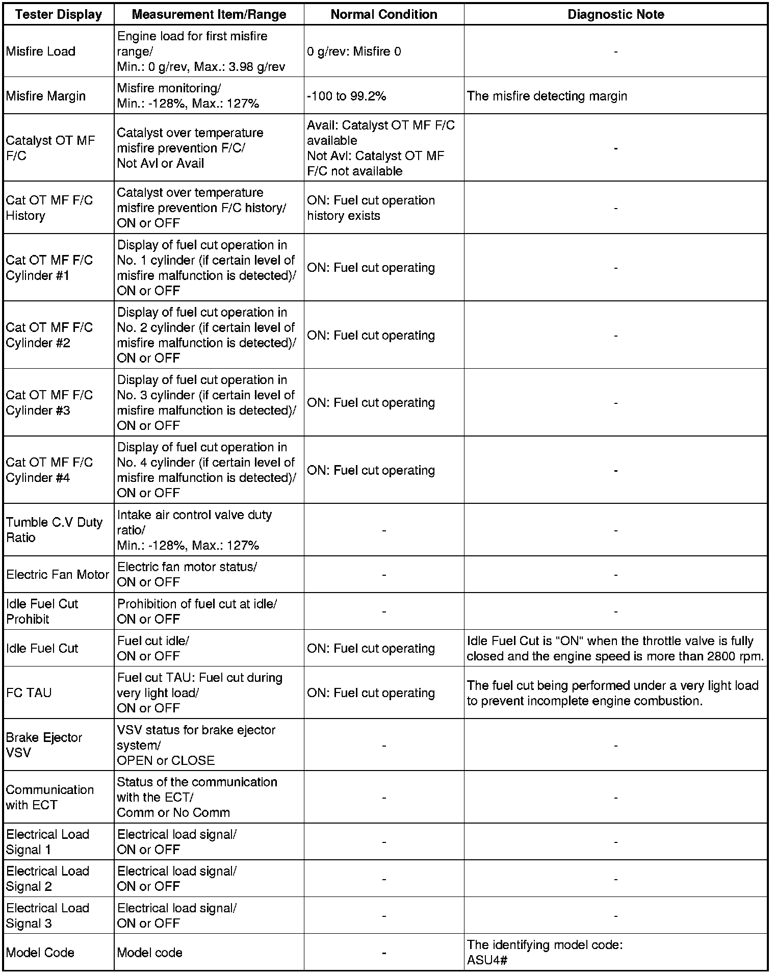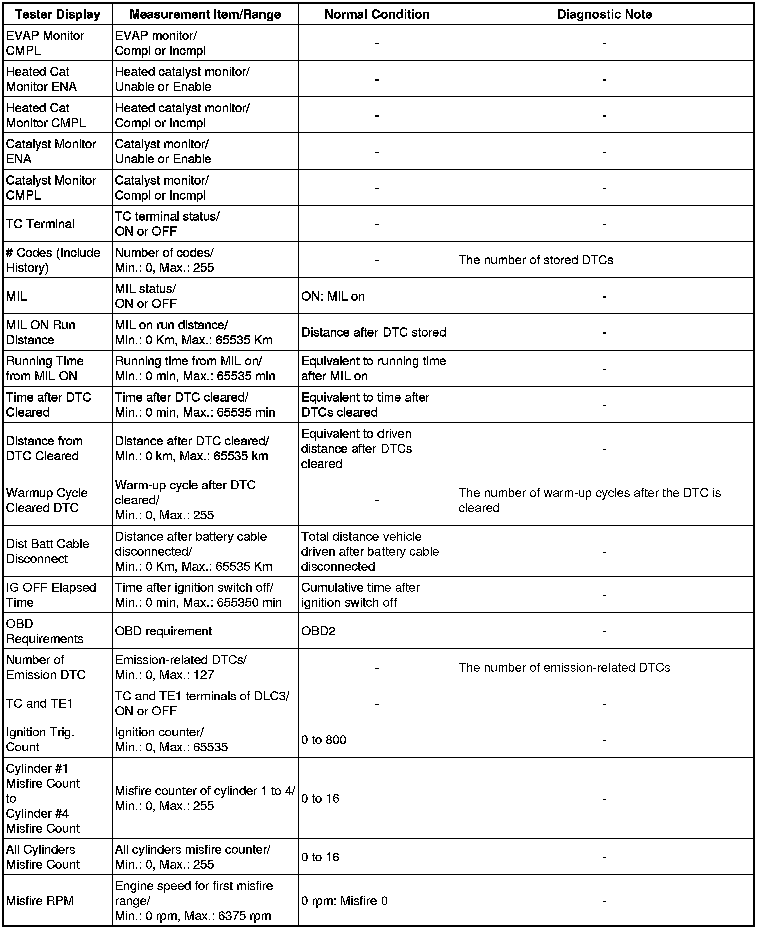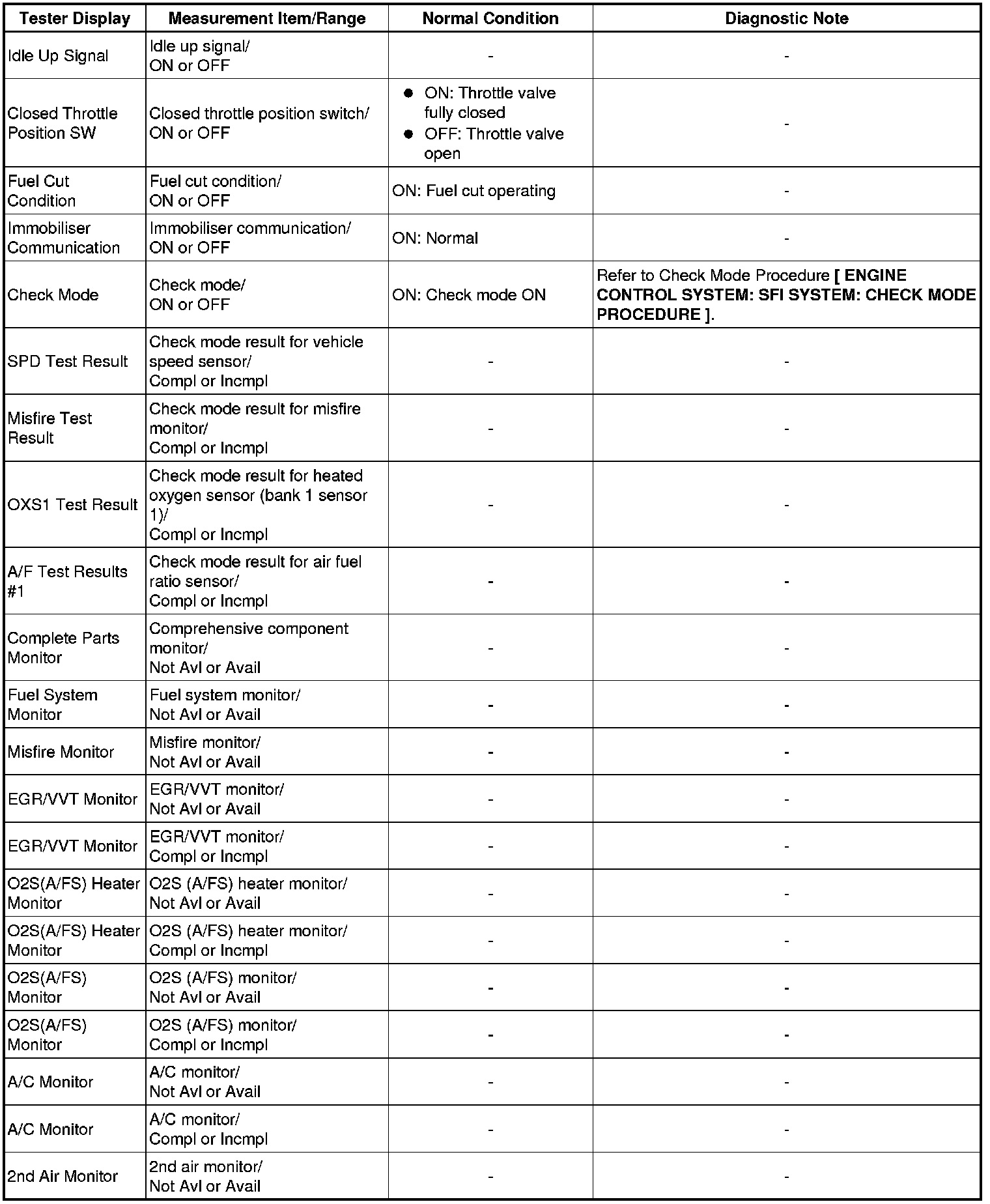 Using the Techstream to read the Data List allows the values or states of switches, sensors, actuators and other items to be read without removing any parts. This non-intrusive inspection can be very useful because intermittent conditions or signals may be discovered before parts or wiring is disturbed. Reading the Data List information early in troubleshooting is one way to save diagnostic time.