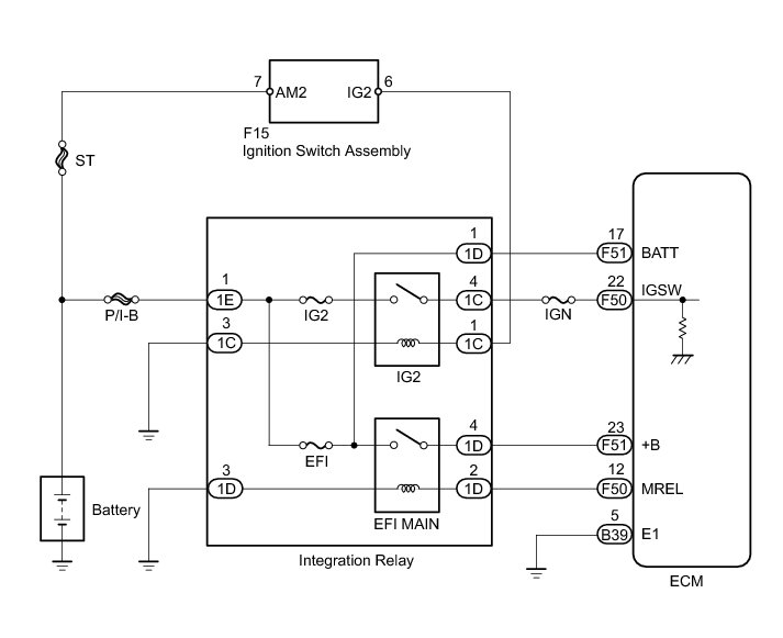 When the ignition switch is turned to ON, battery voltage is applied to terminal IGSW of the ECM. The output signal from the MREL terminal of the ECM causes current to flow to the coil, closing the contacts of the integration relay (EFI MAIN relay) and supplying power to terminal +B of the ECM.