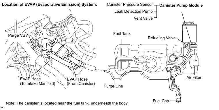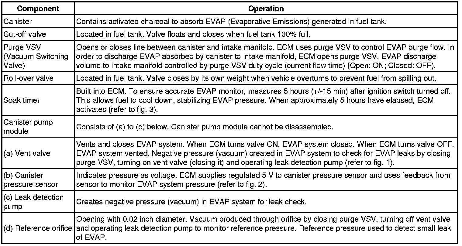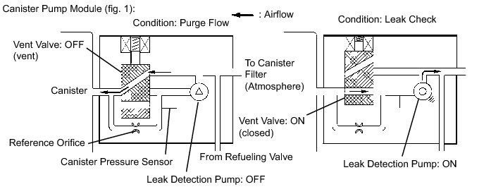 The leak detection pump creates negative pressure (vacuum) in the EVAP system and the pressure is measured. Finally, the ECM monitors for leaks from the EVAP system, and malfunctions in both the canister pump module and purge VSV based on the EVAP pressure.