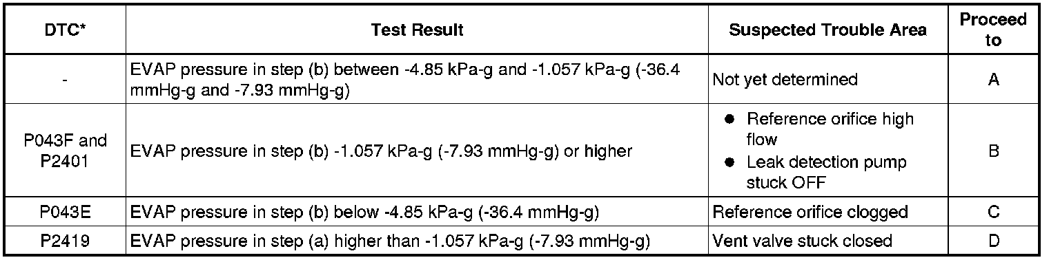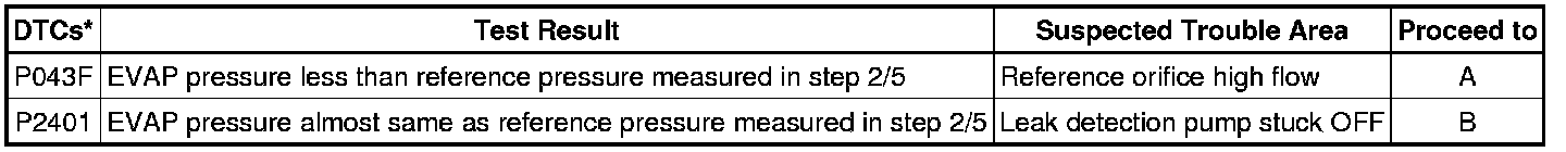 If the reference pressure difference between the first and second checks is more than the specification, all the DTCs relating to the reference pressure (P043E, P043F, P2401, P2402 and P2419) are stored.