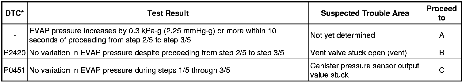 If any EVAP system DTCs are output, the malfunctioning area can be determined using the table below.