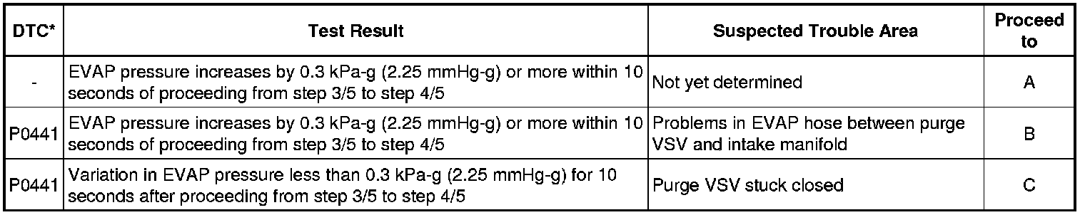 The vent valve is turned OFF (open) and the EVAP pressure is measured. If the variation in the pressure is less than 0.15 kPa-g (1.12 mmHg-g), the ECM interprets this as the purge VSV being stuck closed, illuminates the MIL and stores DTC P0441 (2 trip detection logic).