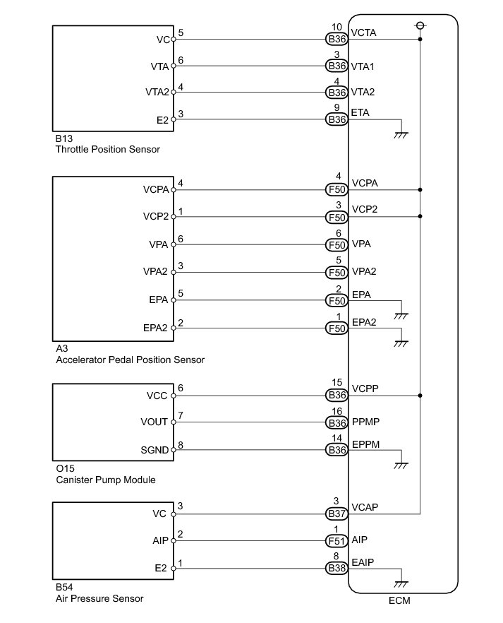 The ECM constantly generates a 5 V power supply voltage from the battery voltage supplied to the +B (BATT) terminal to operate the microprocessor. The ECM also provides this power source voltage to the sensors through the VC output circuit.