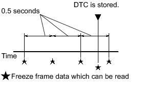The ECM records engine conditions in the form of freeze frame data every 0.5 seconds. Using the Techstream, 5 separate sets of freeze frame data can be checked.