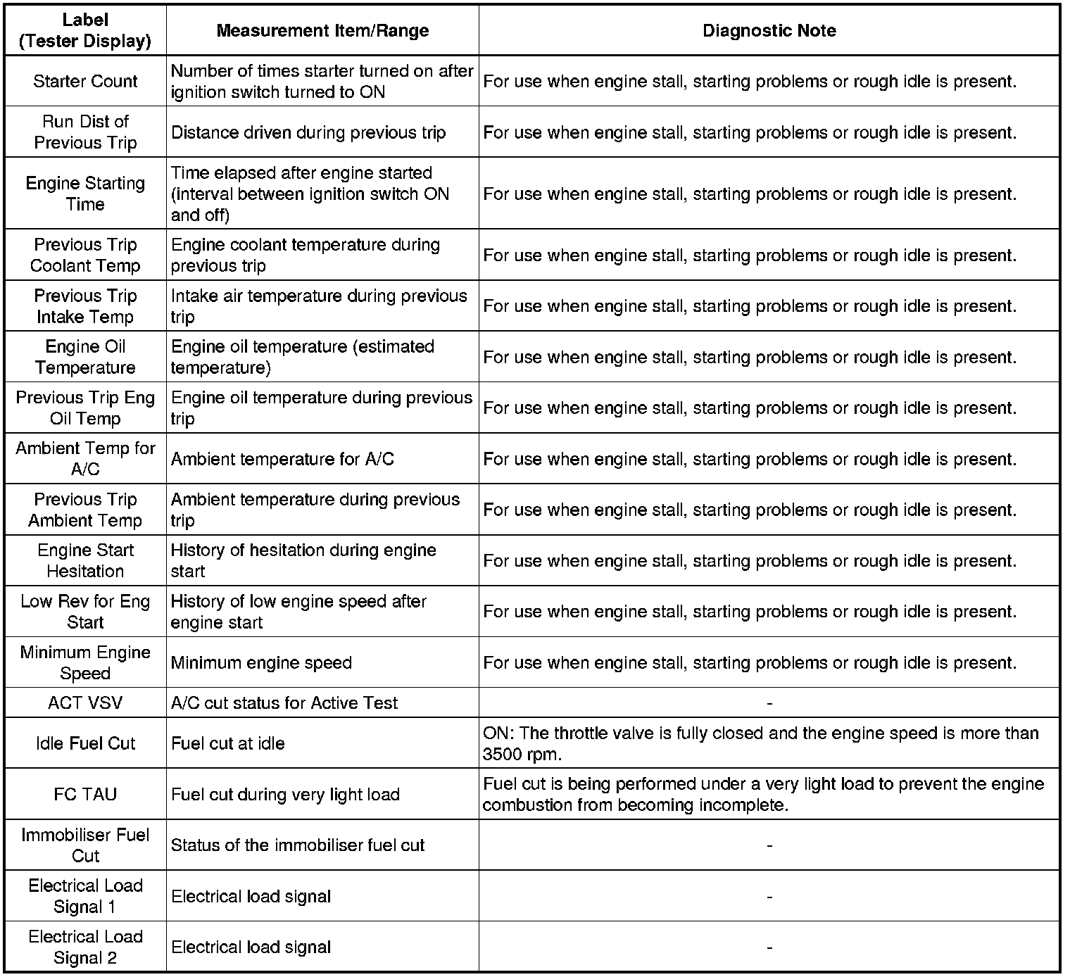 Freeze frame data records the engine conditions (fuel system information, calculated load, engine coolant temperature, fuel trim, engine speed, vehicle speed, etc.) when a malfunction is detected. When troubleshooting, it can help determine if the vehicle was moving or stationary, if the engine was warmed up or not, if the air-fuel ratio was Lean or Rich, and other data from the time the malfunction occurred.