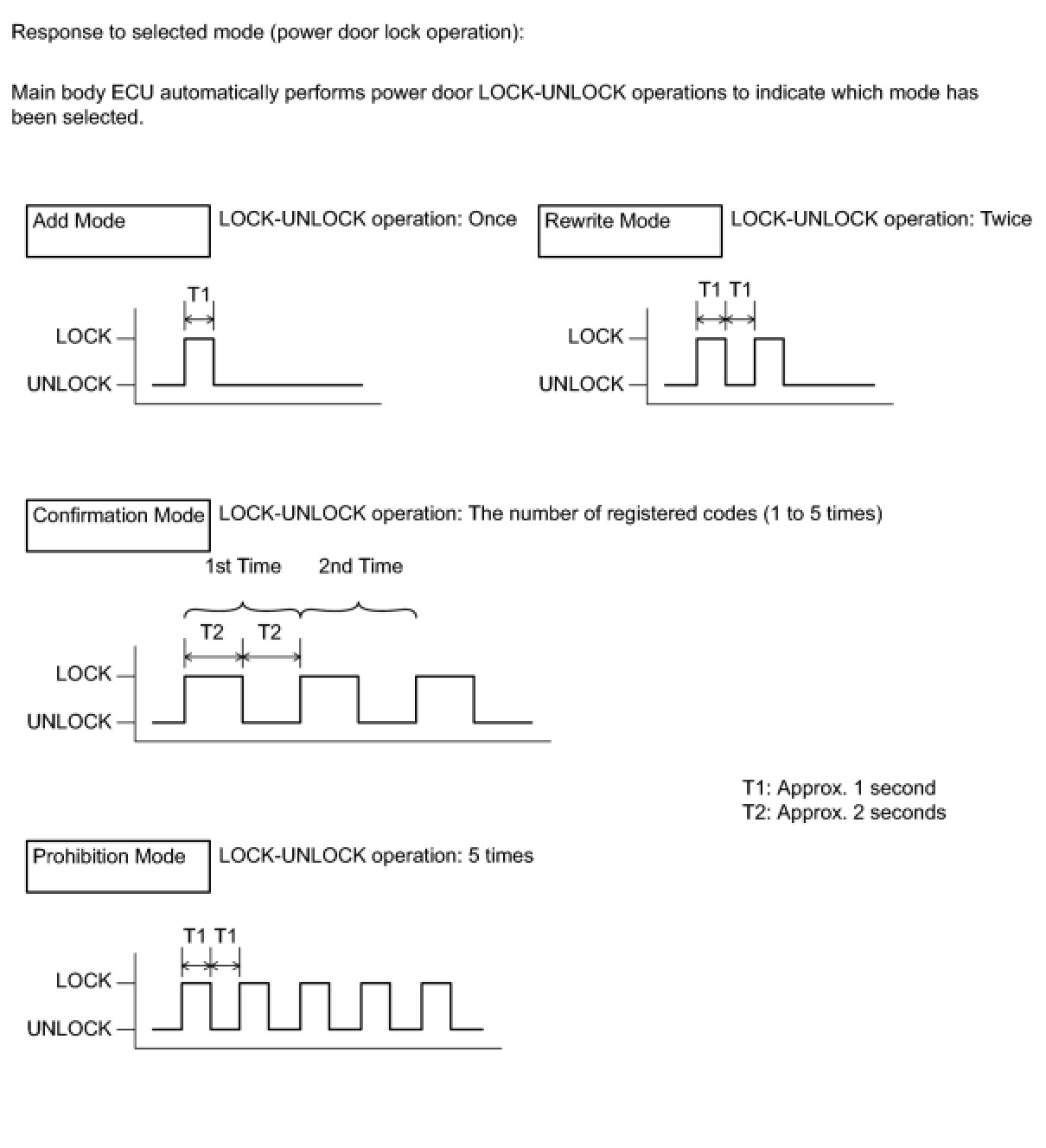 * In the confirmation mode, LOCK-UNLOCK operation will occur once for each recognition code that has been registered. For example, if 2 recognition codes have been registered, LOCK-UNLOCK operation will occur twice.