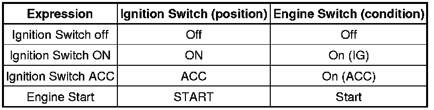 The type of ignition switch used on this model differs according to the specifications of the vehicle. The expressions listed in the table below are used in this section.