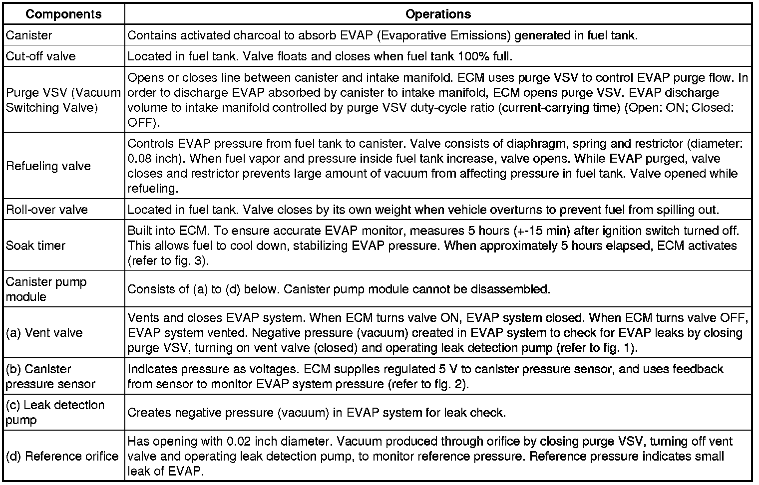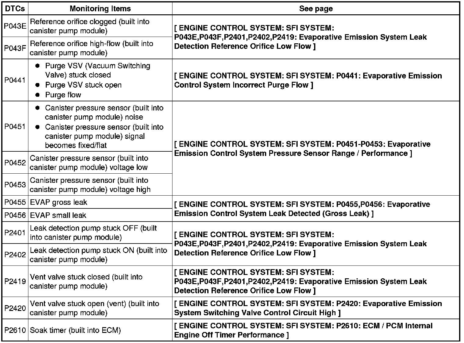The leak detection pump creates negative pressure (vacuum) in the EVAP system and the pressure is measured. Finally, the ECM monitors for leaks from the EVAP system, and malfunctions in both the canister pump module and purge VSV, based on the EVAP pressure.