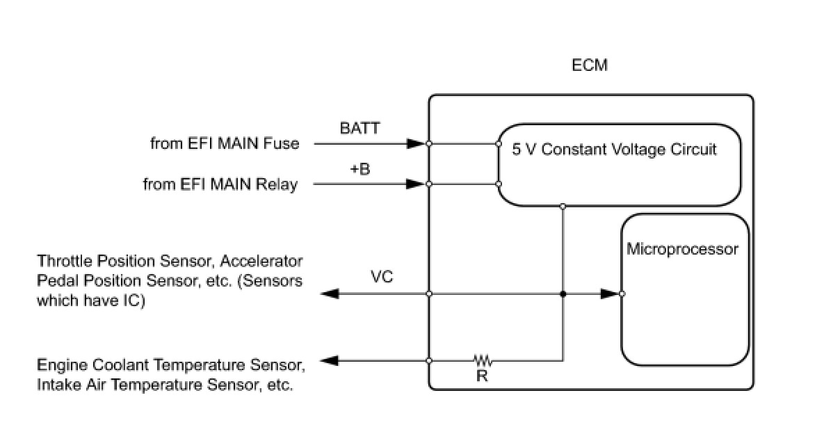 The ECM constantly generates 5 V of power from battery voltage supplied to the +B (BATT) terminal to operate the microprocessor. The ECM also provides this power to the sensors through the VC output circuit.