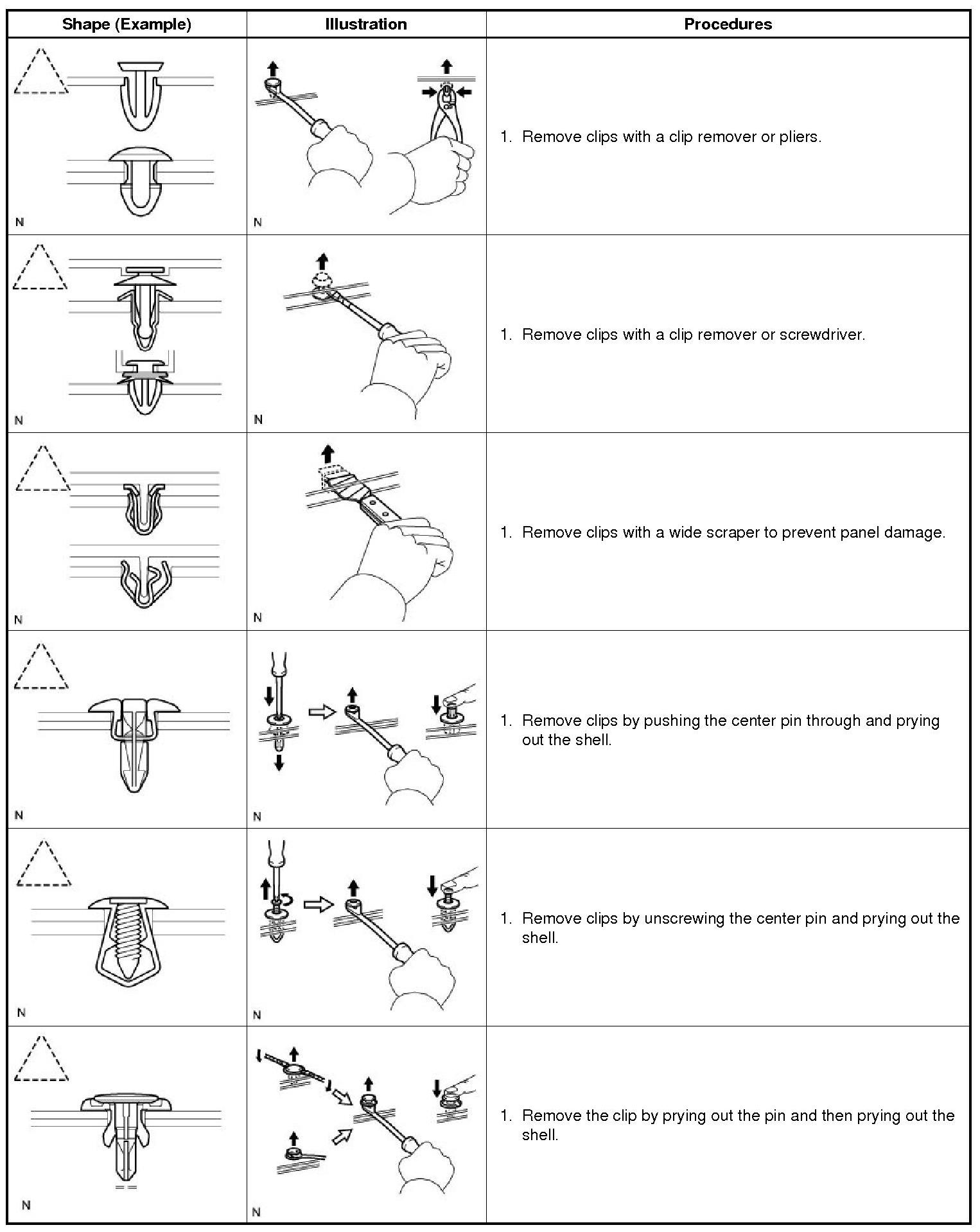 (1) The removal and installation methods of typical clips used for vehicle body parts are shown in the table below.