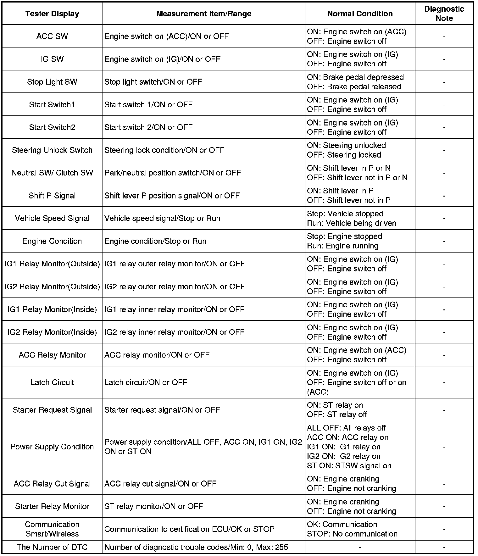 Using the Techstream to read the Data List allows the values or states of switches, sensors, actuators and other items to be read without removing any parts. This non-intrusive inspection can be very useful because intermittent conditions or signals may be discovered before parts or wiring is disturbed. Reading the Data List information early in troubleshooting is one way to save diagnostic time.