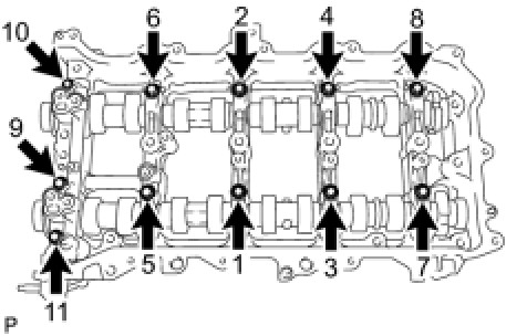 Install the camshaft housing, and then install the 20 bolts in the order shown in the illustration.