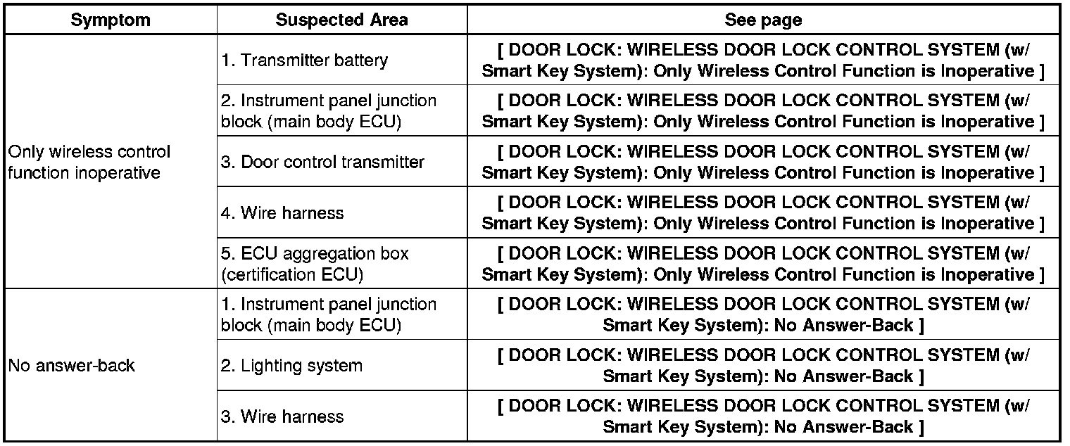DOOR LOCK: WIRELESS DOOR LOCK CONTROL SYSTEM (w/ Smart Key System): PROBLEM SYMPTOMS TABLE