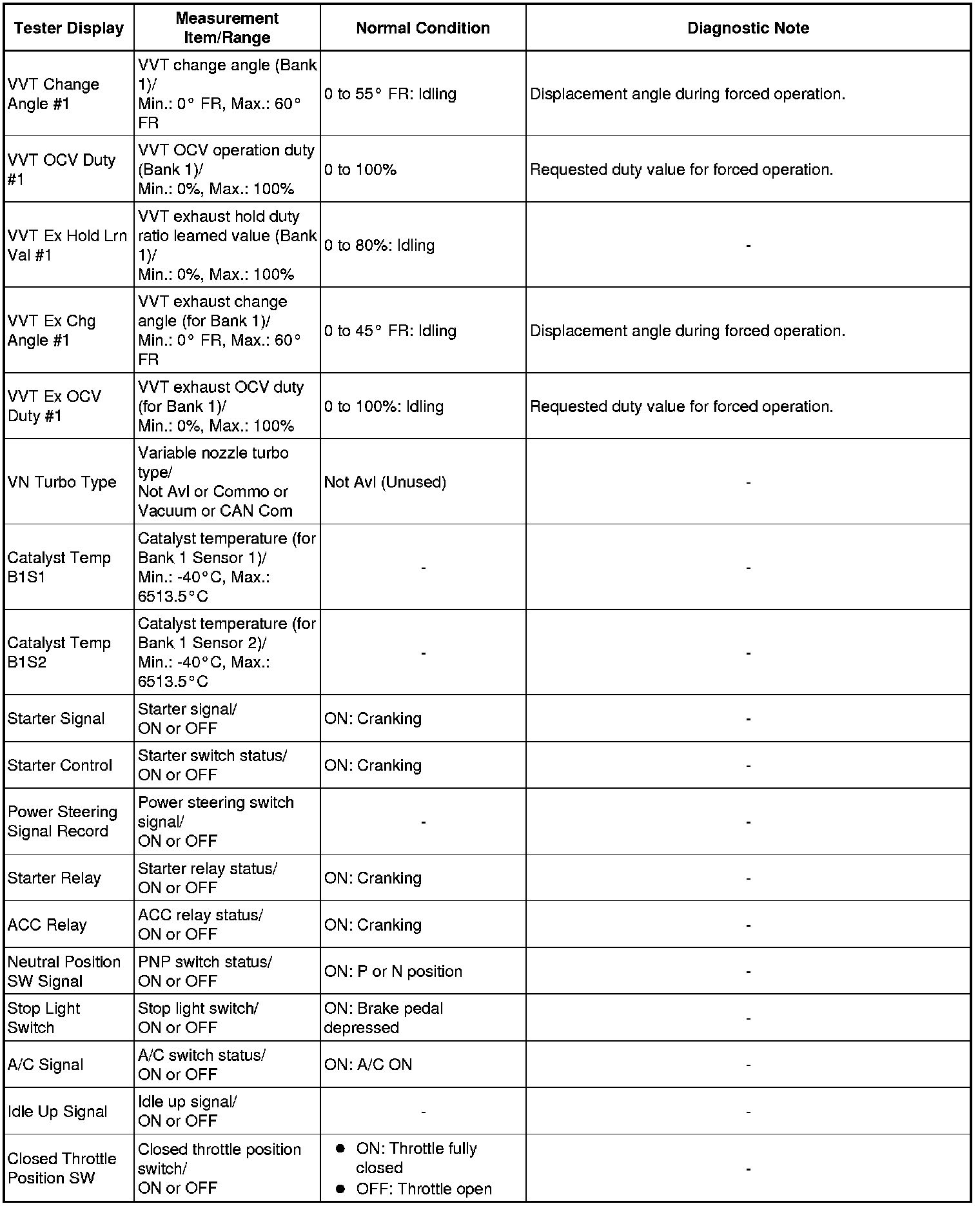 Using the Techstream to read the Data List allows the values or states of switches, sensors, actuators and other items to be read without removing any parts. This non-intrusive inspection can be very useful because intermittent conditions or signals may be discovered before parts or wiring is disturbed. Reading the Data List information early in troubleshooting is one way to save diagnostic time.
