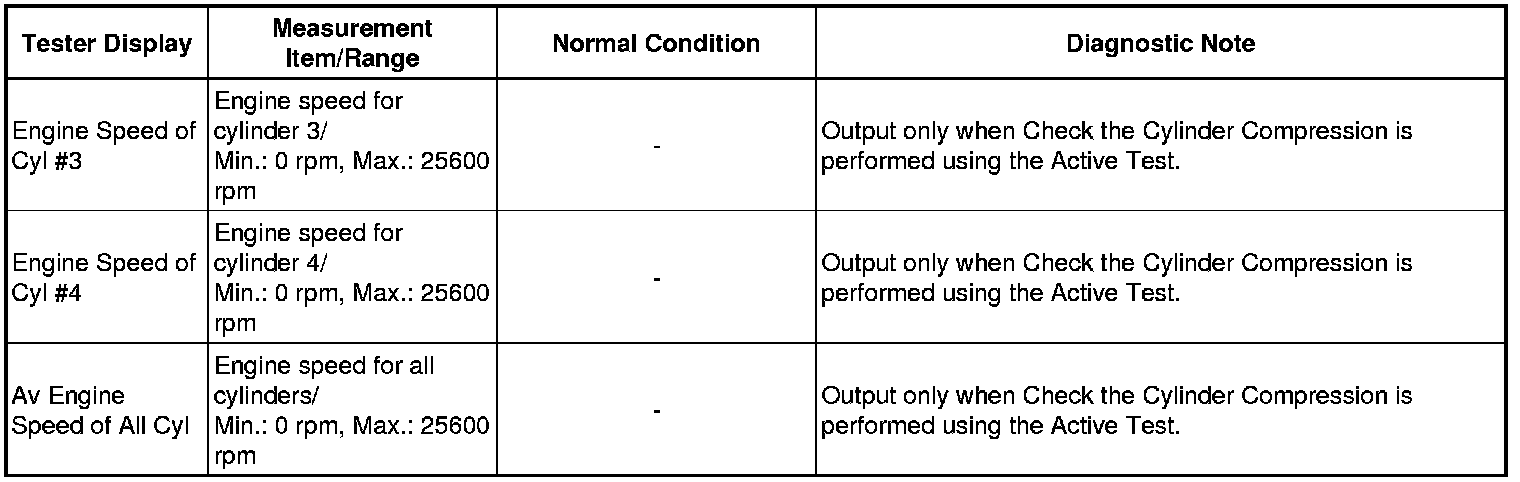 In this Active Test, the fuel and ignition of all cylinders is cut. The engine must then be cranked for approximately 10 seconds. At this time, the speed of each cylinder is measured. If the speed of one cylinder is more than the other cylinders, it can be determined that the compression pressure of that cylinder is lower than the other cylinders.