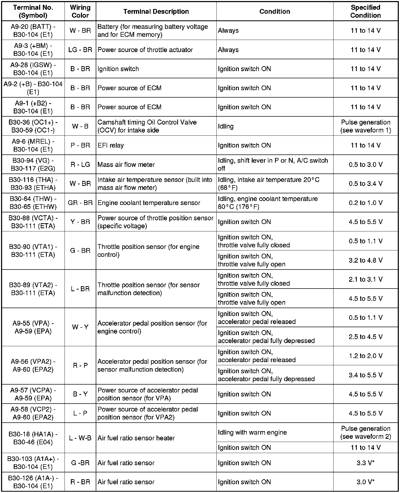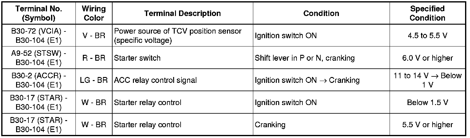The standard voltage between each pair of ECM terminals is shown in the table below. The appropriate conditions for checking each pair of terminals are also indicated. The result of checks should be compared with the standard voltage for that pair of terminals, displayed in the Specified Condition column. The illustration above can be used as a reference to identify the ECM terminal locations.