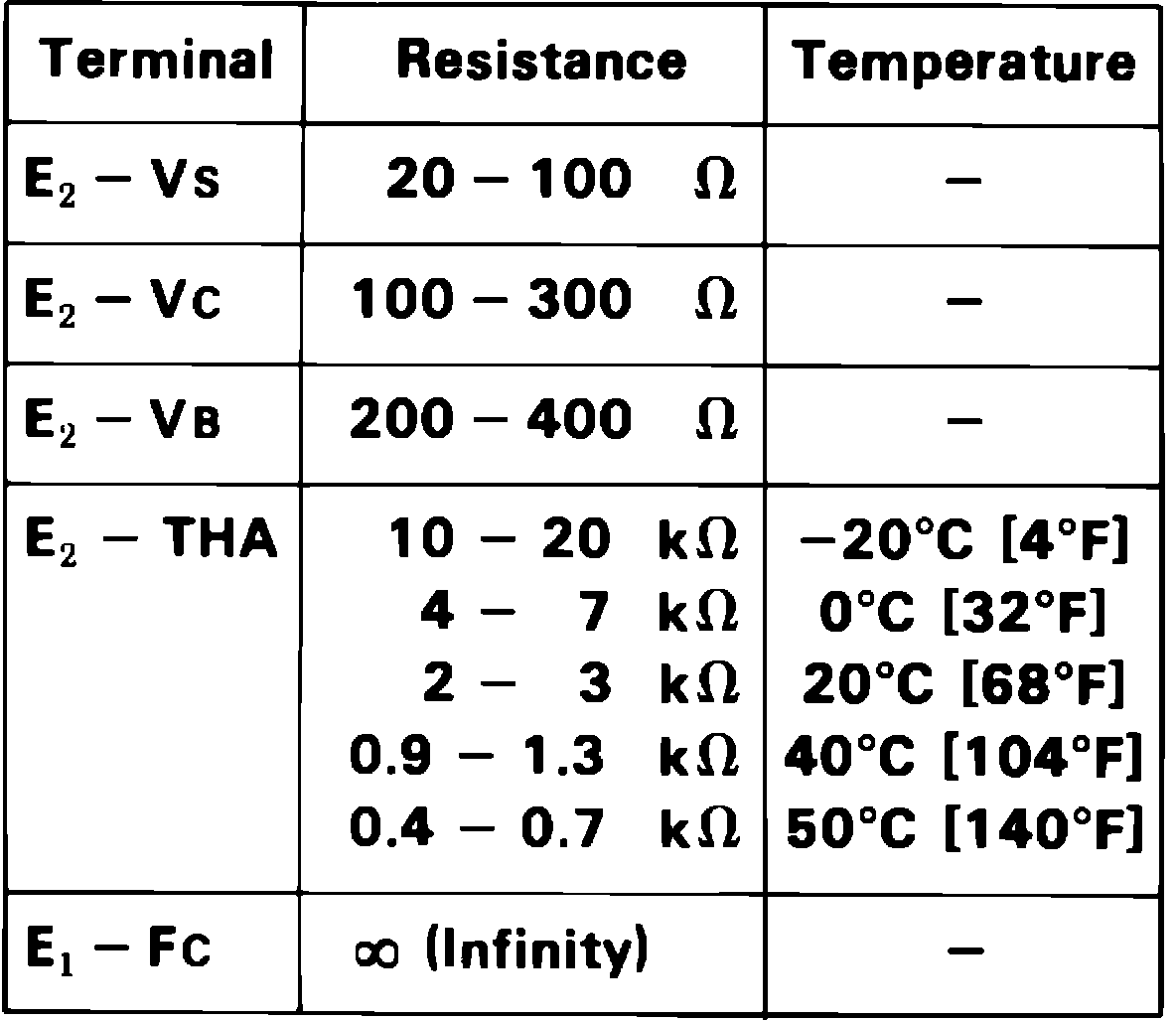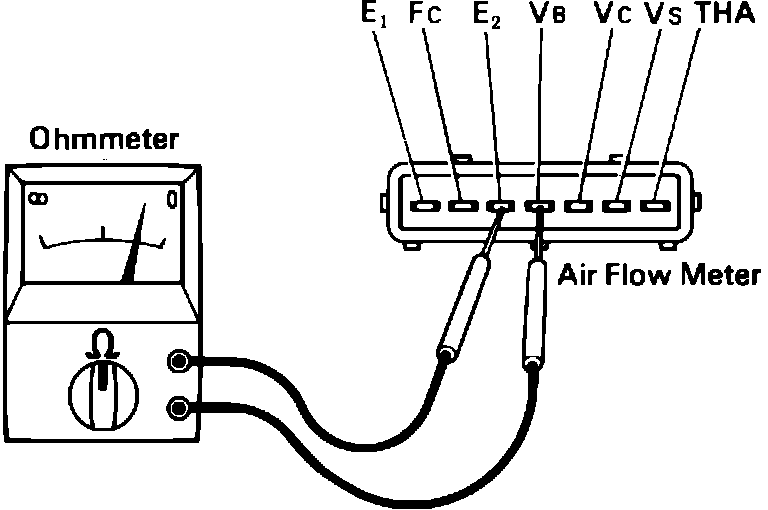 3. With air flow meter removed from vehicle, check resistance at electrical connector, Fig. 4. With measuring plate fully closed, resistance between terminals E(2) and VS should be 20-100 ohms. In any other position reading should be 20-1000 ohms.