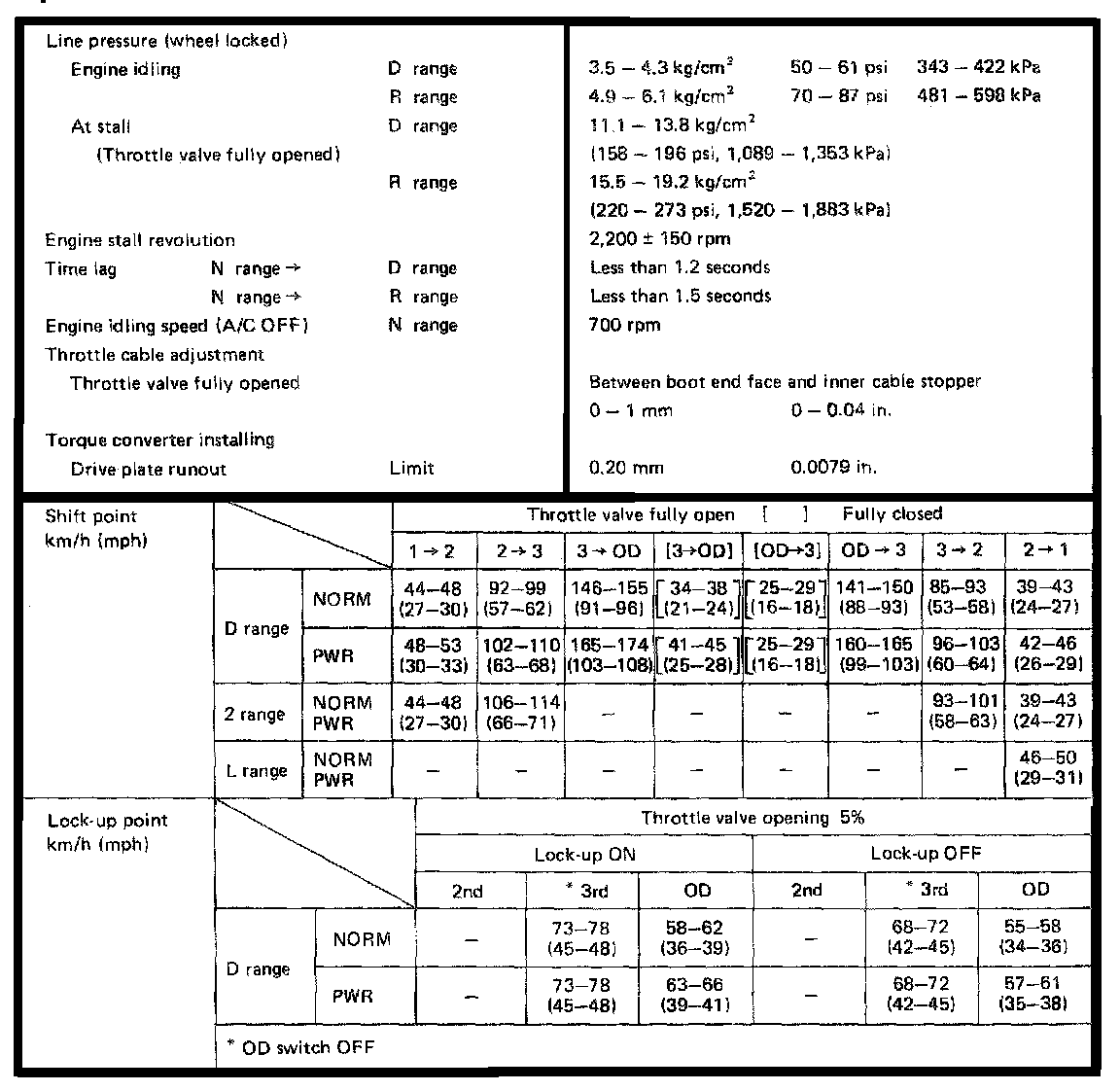 A340E 3-spd O/D A/T, Line Pressure/Shift Points: