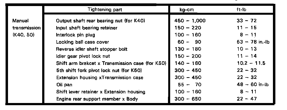 K40 4-spd/K50 5-spd M/T, Transmission Torque: