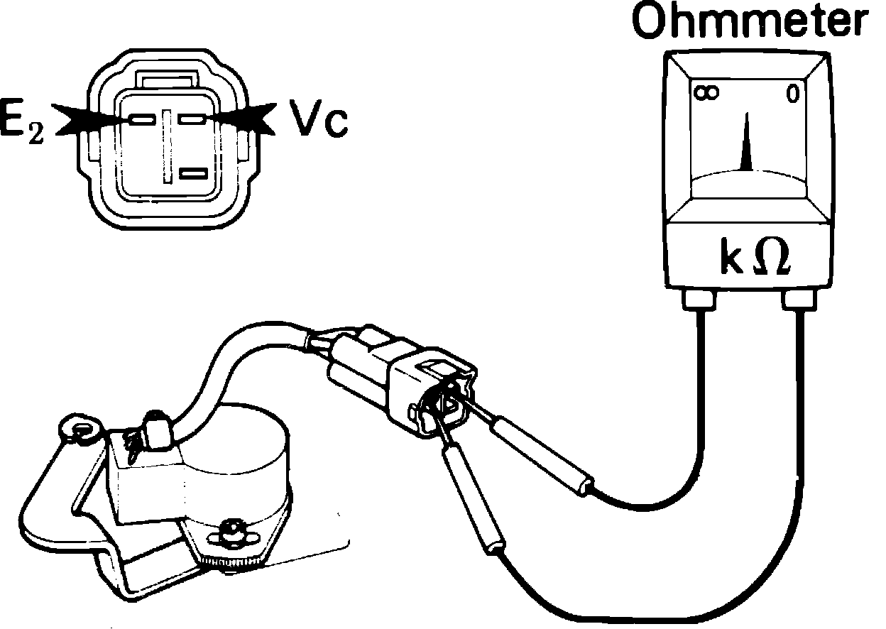 3. Ensure resistance between connector terminals E2 and that below Vc decreases as throttle lever is moved from closed to open position.
