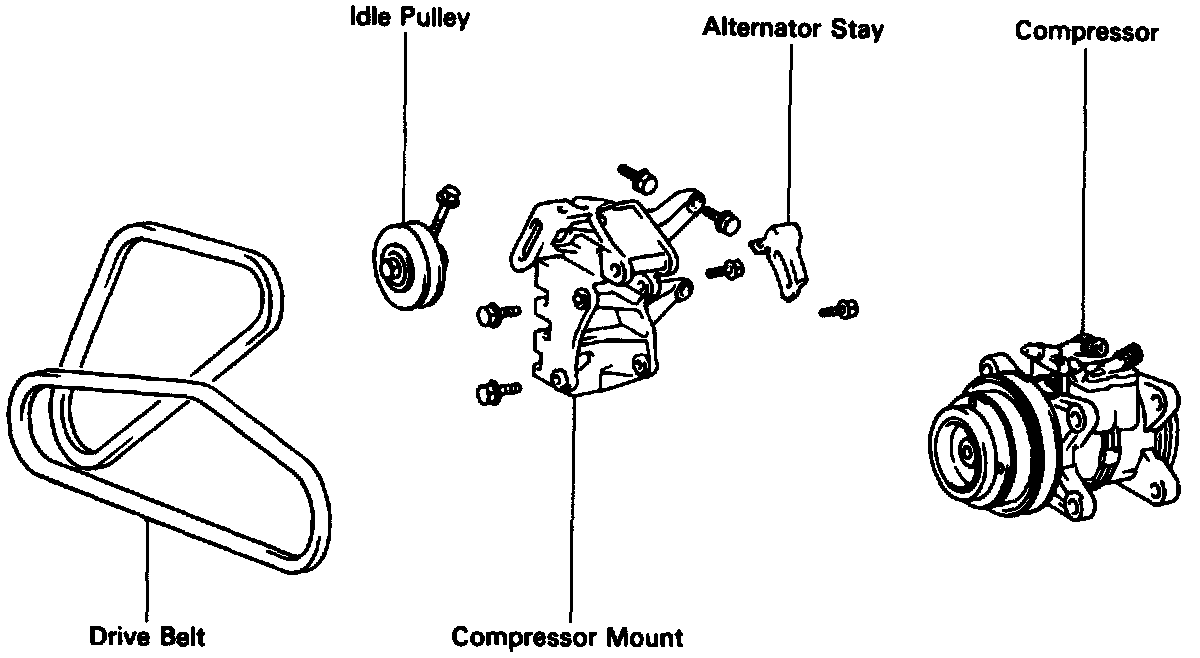 7. Loosen the drive belt. Remove the compressor mounting bolts and the compressor.