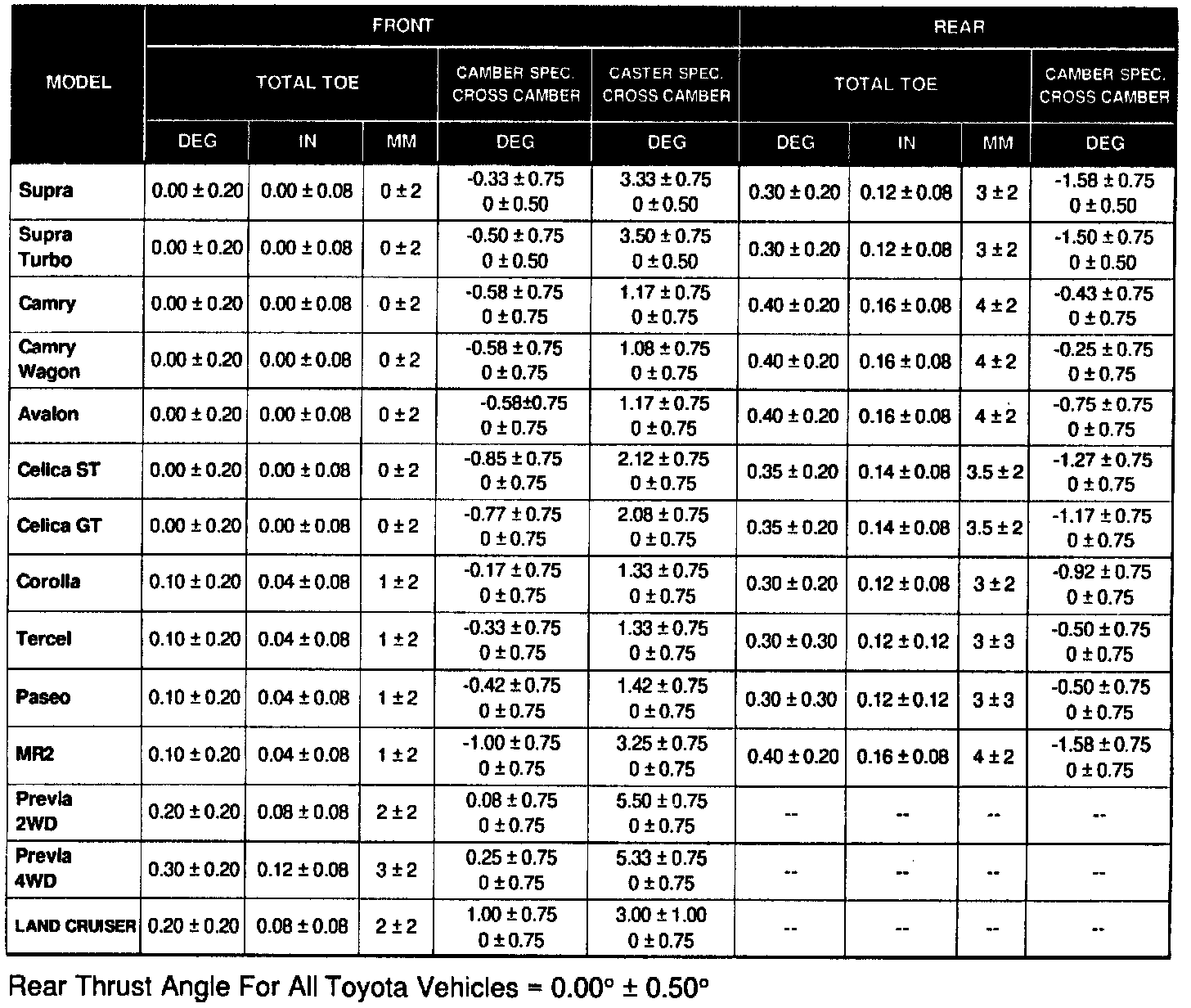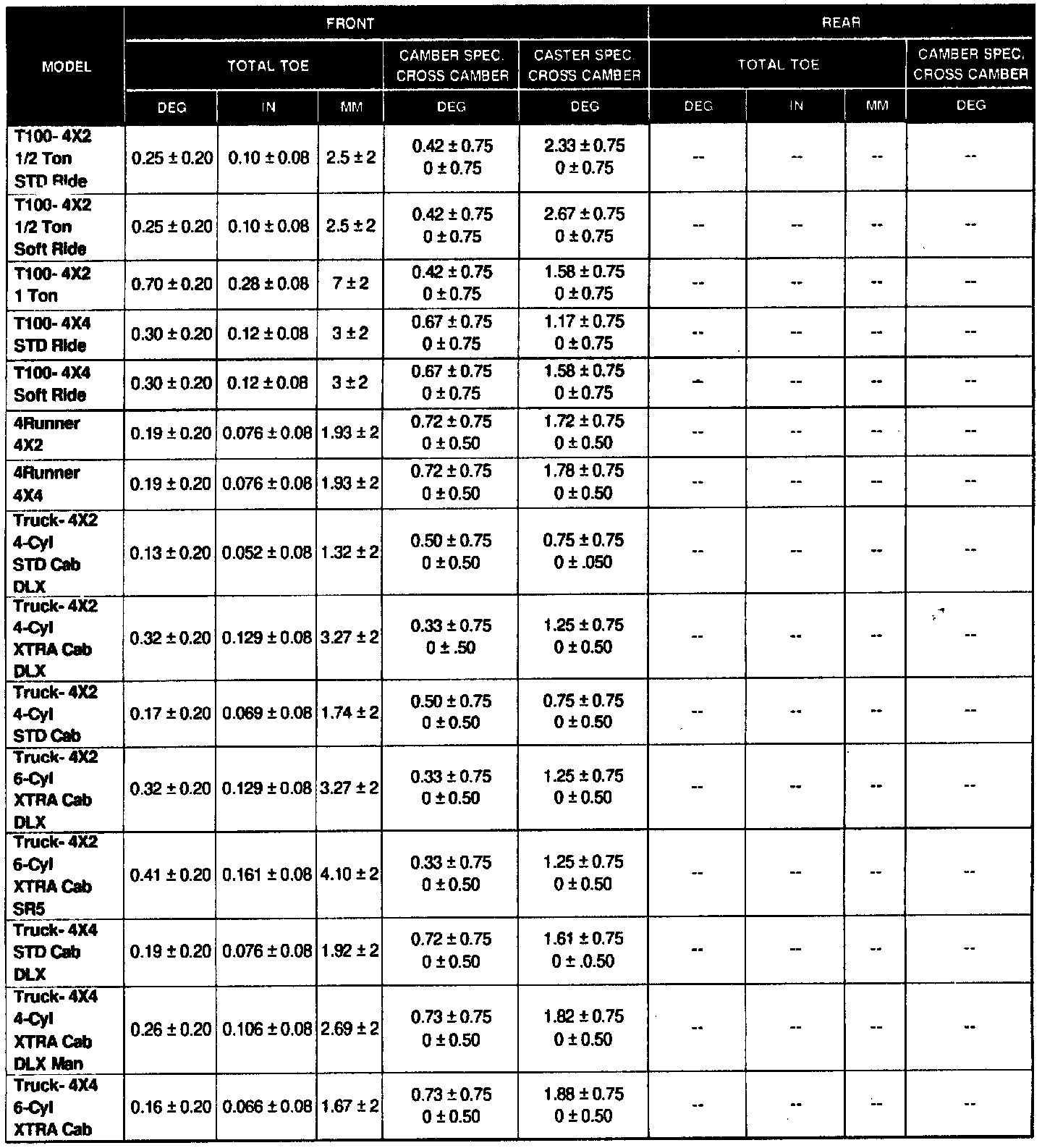 '95 MODEL YEAR VEHICLE ALIGNMENT SPECIFICATIONS