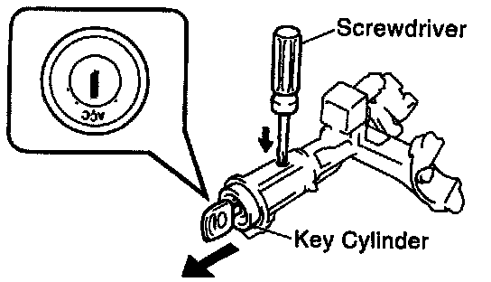 3. Insert a small diameter rod into hole located on side of lock cylinder, then while holding down pin, remove lock cylinder.