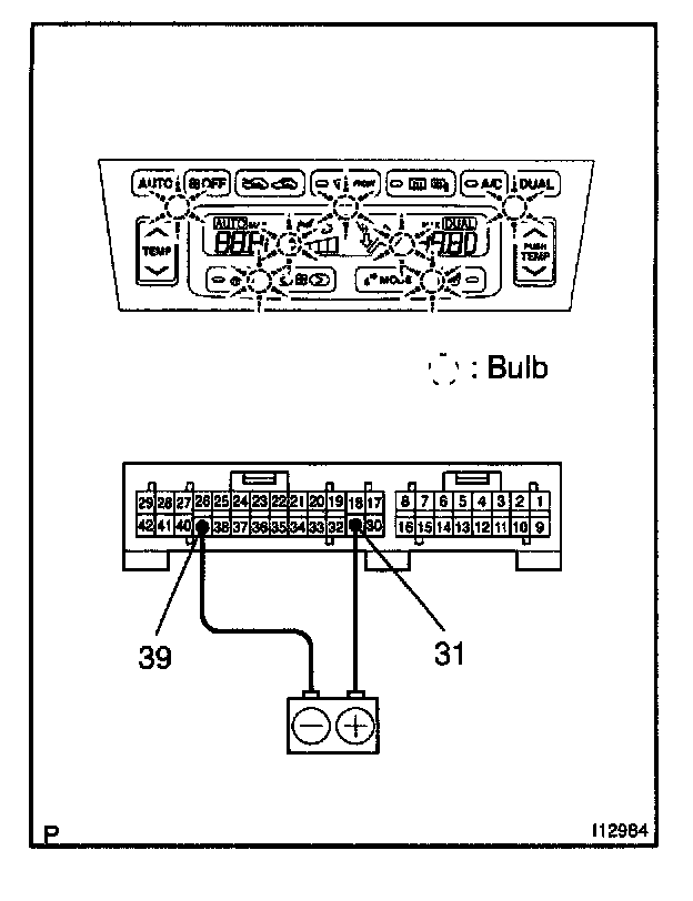 Connect the positive (+) lead from the battery to terminal 31 and the negative (-) lead to terminal 39, then check that the illumination lights up.