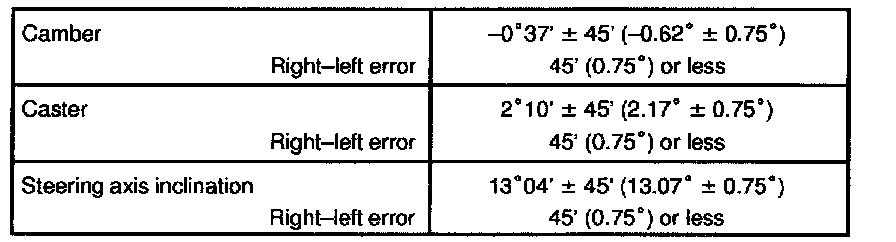 If the caster and steering axis inclination are not within the specified values, after the camber has been correctly adjusted, recheck the suspension parts for damaged and/or worn out parts.