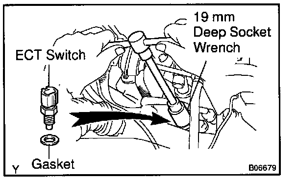 b. Using a 19 mm deep socket wrench, remove the ECT sensor and gasket.
