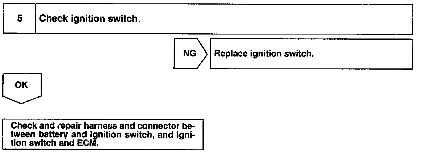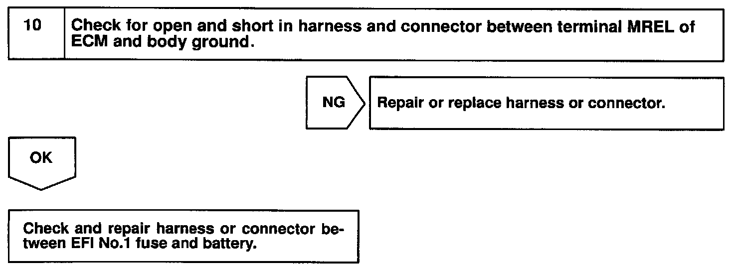 When the ignition switch is turned ON, battery positive voltage is applied to terminal IGSW of the ECM and the EFI main relay (Marking; EFI) control circuit in the ECM sends a signal to terminal MREL of the ECM switching on the EFI main relay.