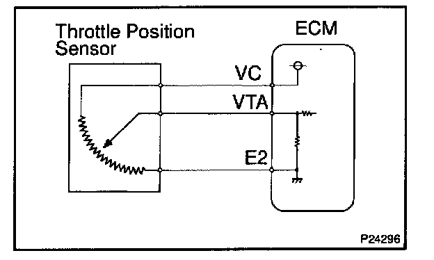 When the throttle valve is fully closed, voltage is applied to terminal VTA of the ECM.