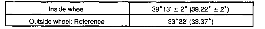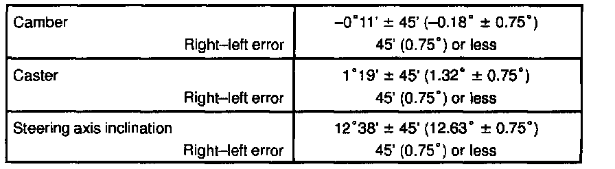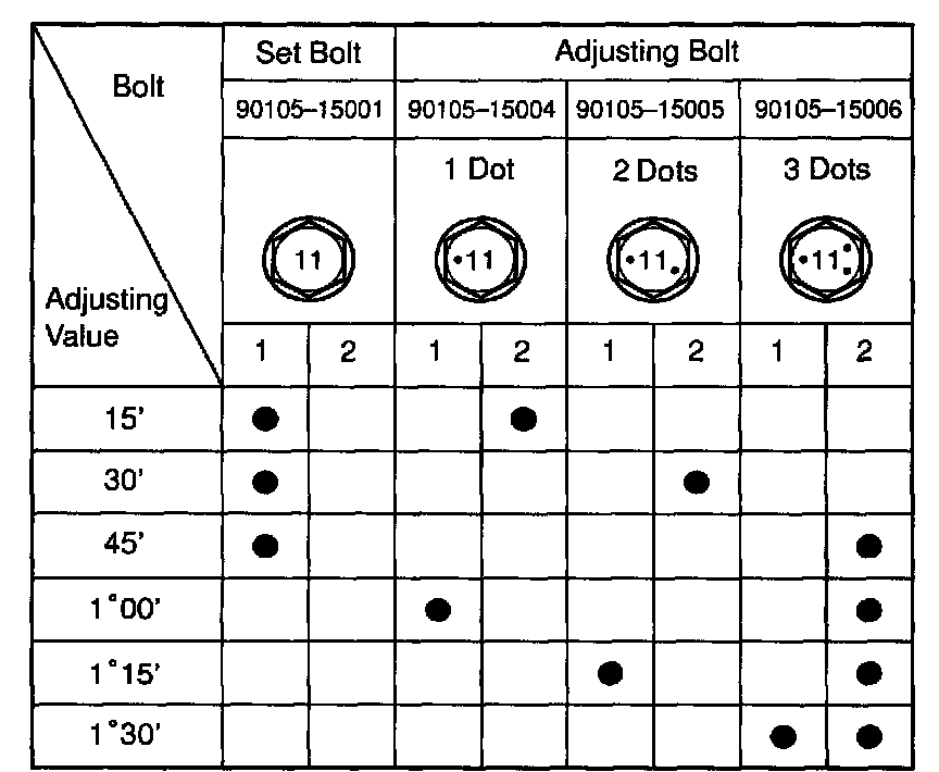 - Adjusting value for the set bolts is 6'- 30' (0.1° - 0.5°). If the camber is not within the specified value, using the table, estimate how much additional camber adjustment will be required, and select the camber adjusting bolt.