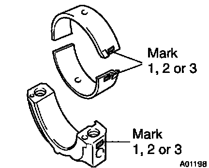 HINT: If replacing a bearing, replace it with one having the same number as marked on the connecting rod. There are 3 sizes of standard bearings, marked "1", "2" and "3" accordingly.