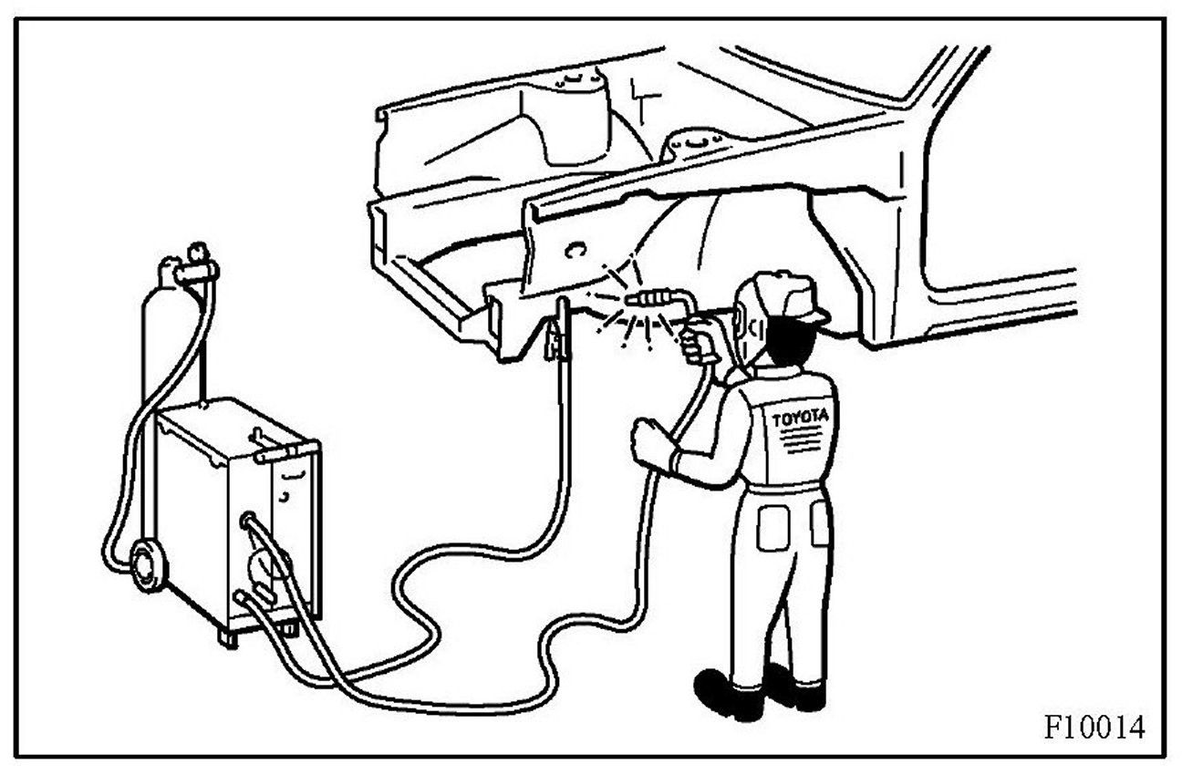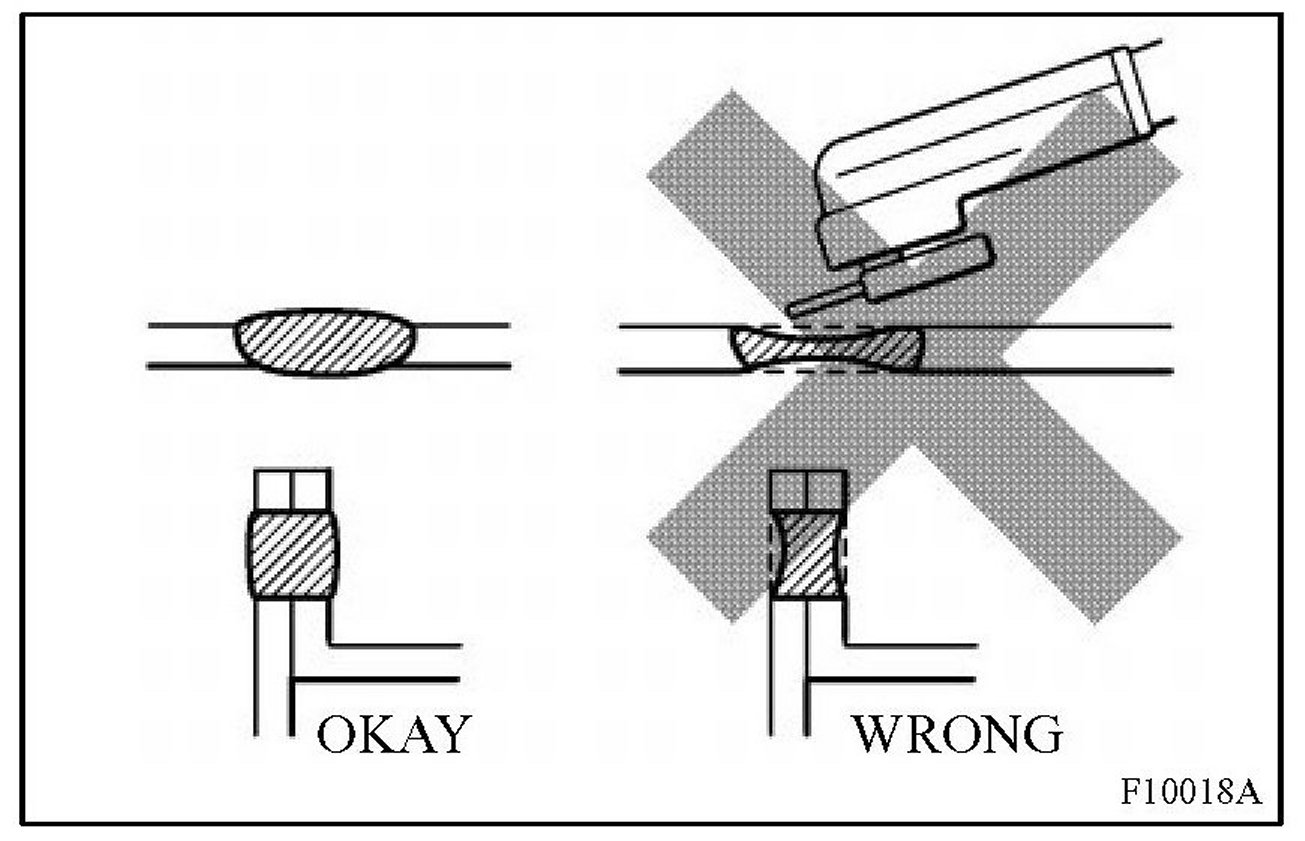 2. Plug welding should be done with a MIG (Metal Inert Gas) welder. Do not gas weld or braze panels at areas other than specified.