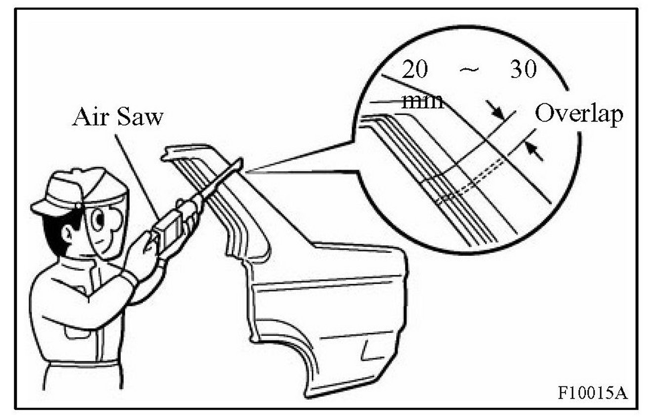 1. For joint areas, rough cut the new parts, leaving 20 - 30 mm (0.79 - 1.18 in.) overlap.