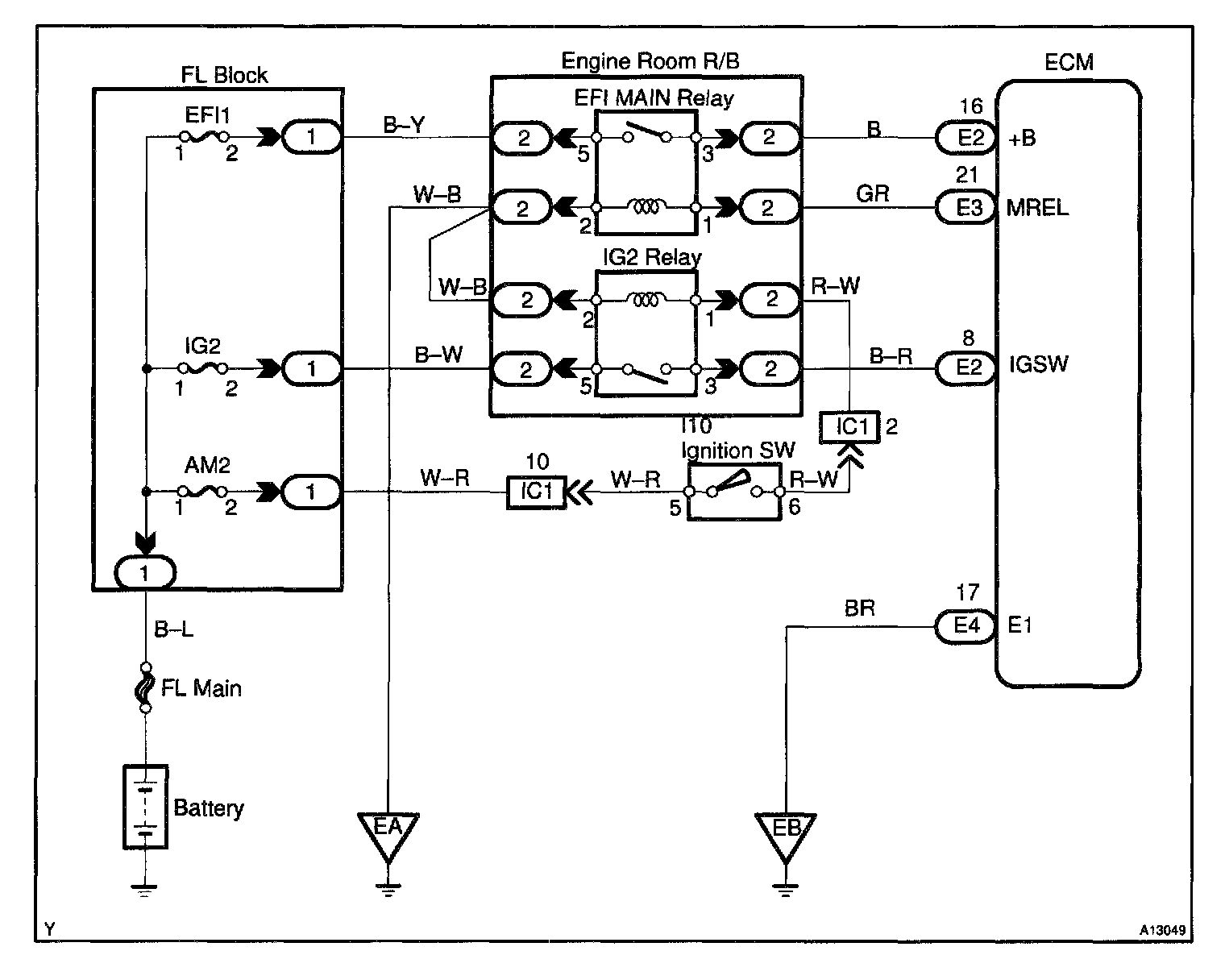 CIRCUIT DESCRIPTIONWhen the ignition switch is turned on, battery positive voltage is applied to IG2 Relay, terminal IGSW of the ECM and the EFI main relay (Marking: EFI MAIN) control circuit in the ECM sends a signal to terminal MREL of the ECM switching on the EFI main relay.