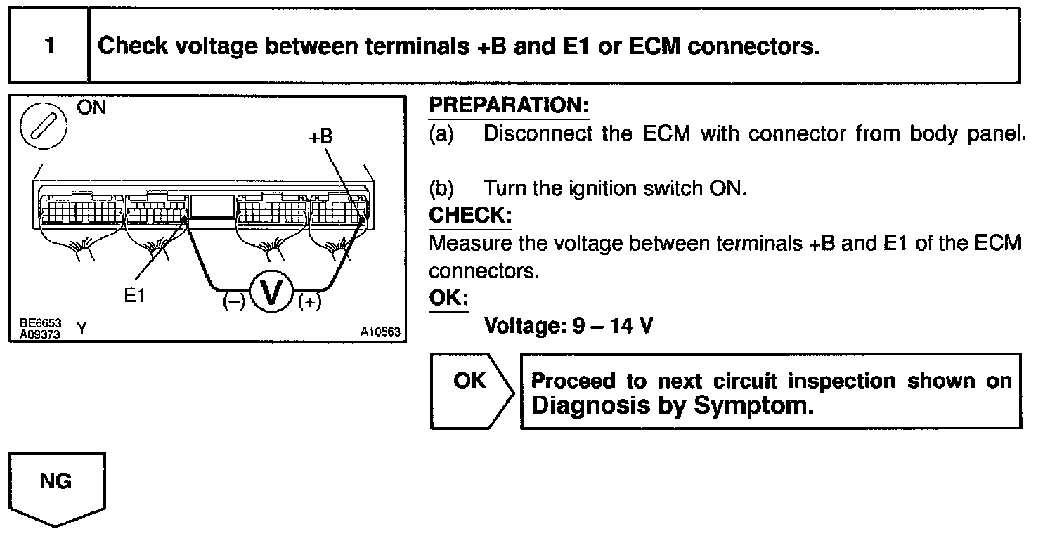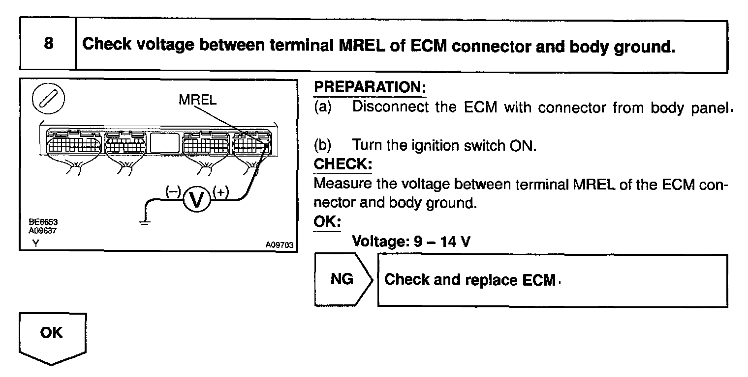 This signal causes current to flow to the coil, closing the contacts of the EFI main relay and supplying power to terminals +B of the ECM.