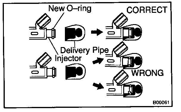 C. Install the injector to the delivery pipe and cylinder head, as shown in the illustration. Before in installing the injector, must apply spindle oil or gasoline on the place where a delivery pipe or a cylinder head touches on O-ring of the injector.