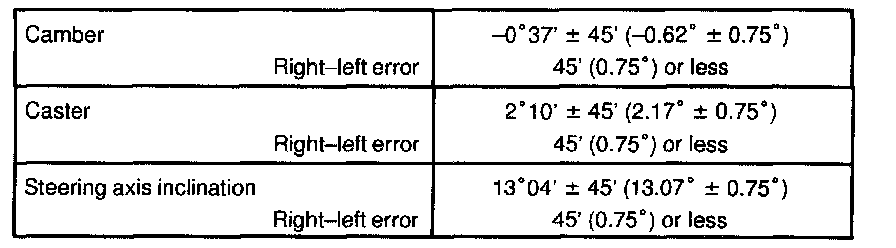 If the caster and steering axis inclination are not within the specified values, after the camber has been correctly adjusted, recheck the suspension parts for damaged and/or worn out parts.