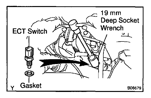 b. Using a 19 mm deep socket wrench, remove the ECT sensor and gasket.