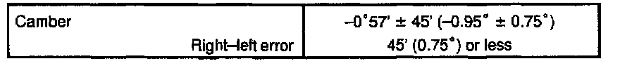 If the measured value is not within the specified value, inspect the suspension parts for damage and/or wear and replace them if necessary because camber is not adjustable.