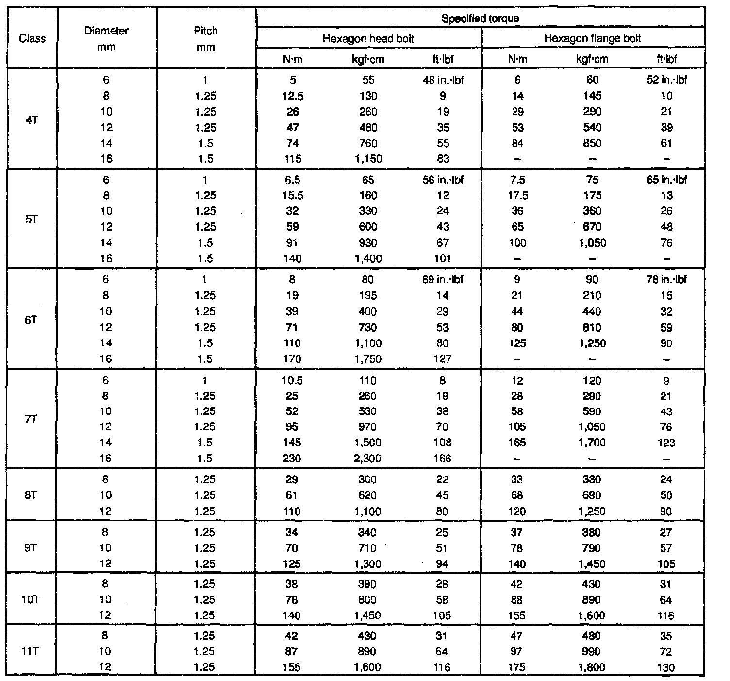 SPECIFIED TORQUE FOR STANDARD BOLTS: