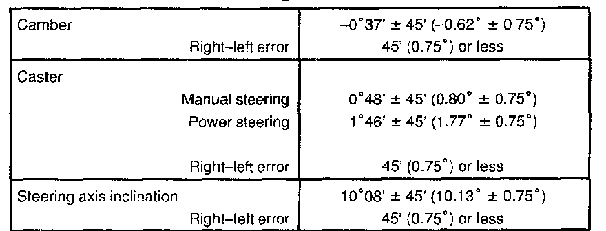 If the caster and steering axis inclination are not within the specified values, after the camber has been correctly adjusted, recheck the suspension parts for damaged and/or worn out parts.