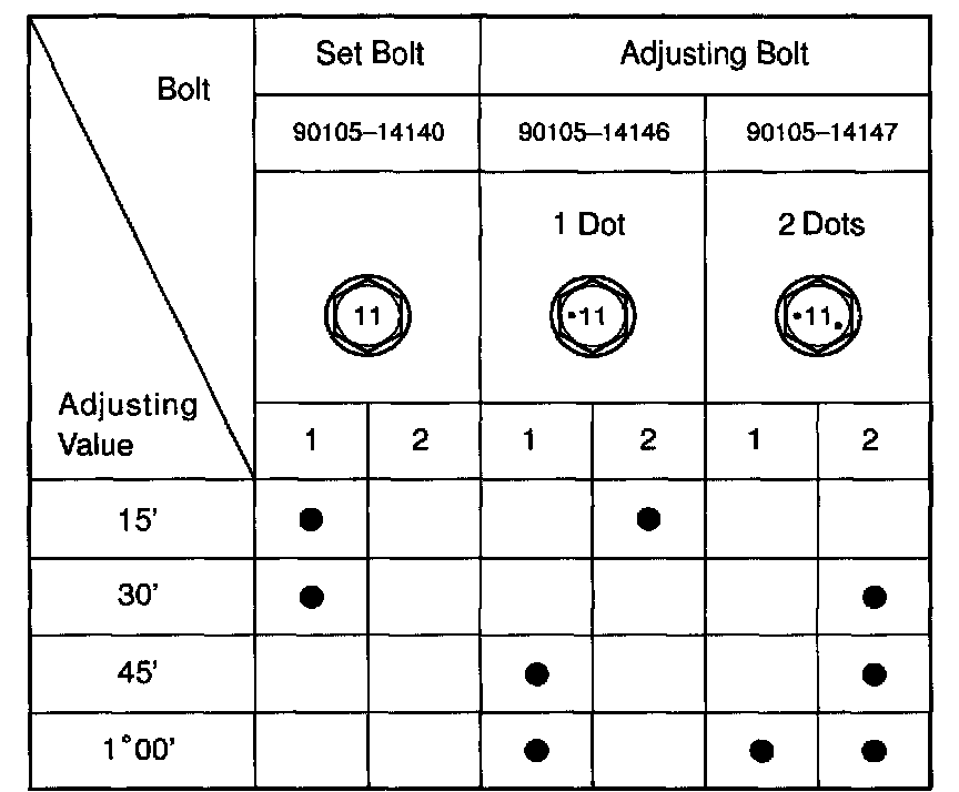 If the camber is not within the specified value, using the following table, estimate how much additional camber adjustment will be required, and select the camber adjusting bolt.
