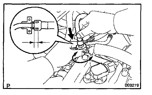 c. Install the injector to the delivery pipe and cylinder head, as shown in the illustration. Before installing the injector, must apply spindle oil or gasoline on the place where a delivery pipe or a cylinder head touches on O-ring or grommet of the injector.